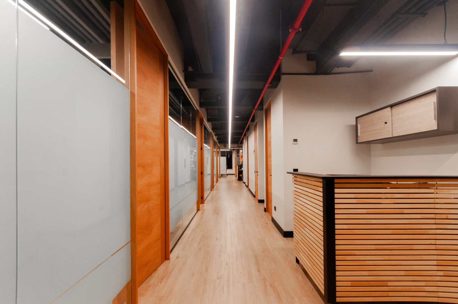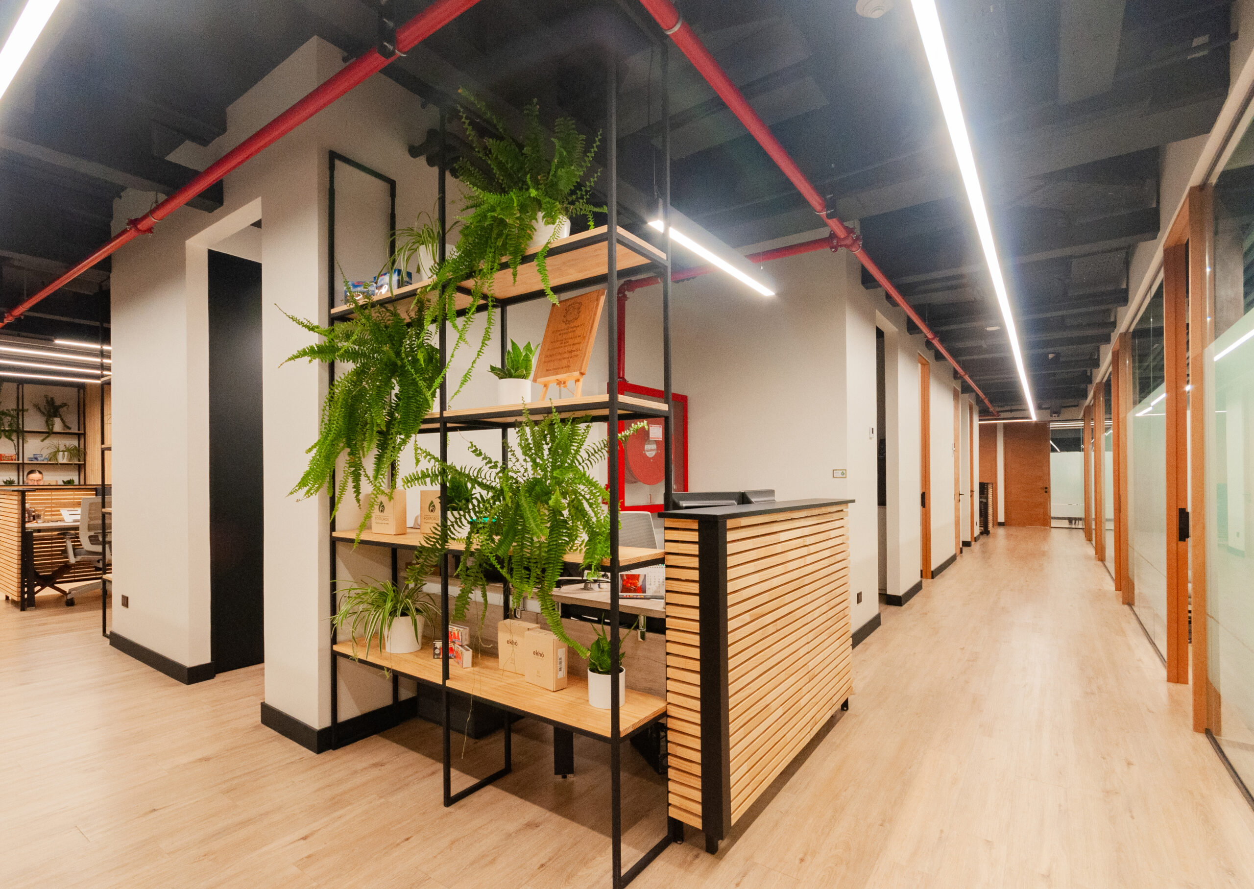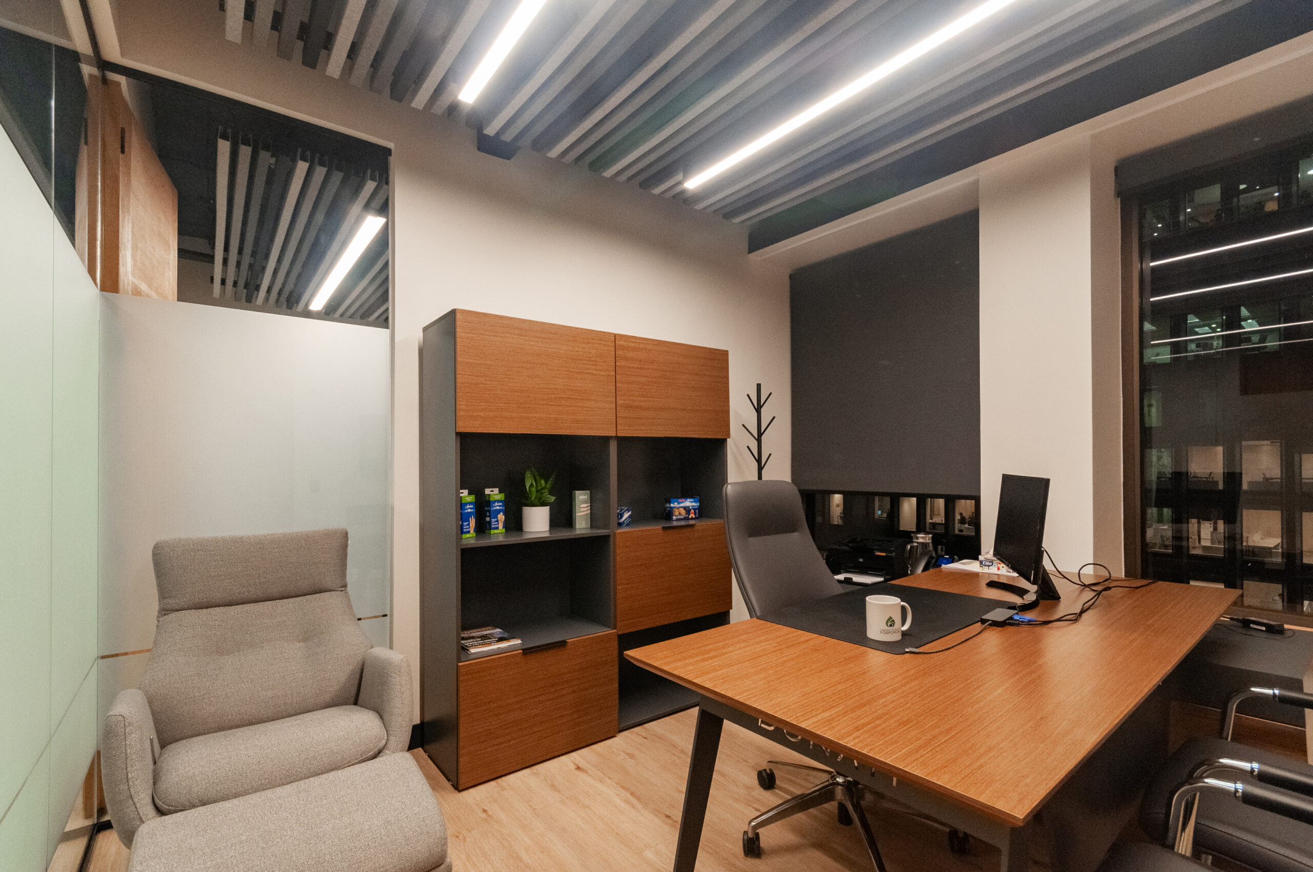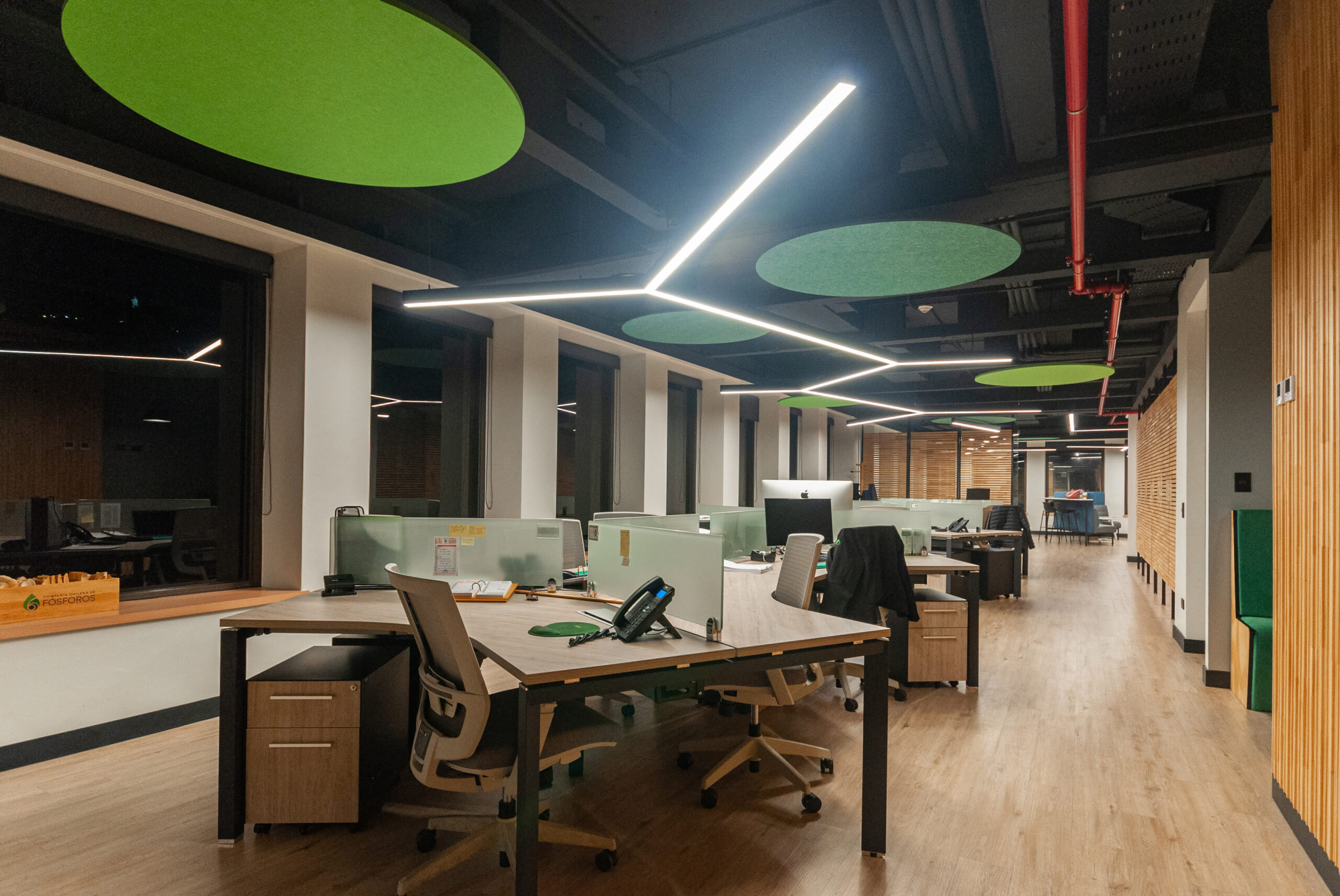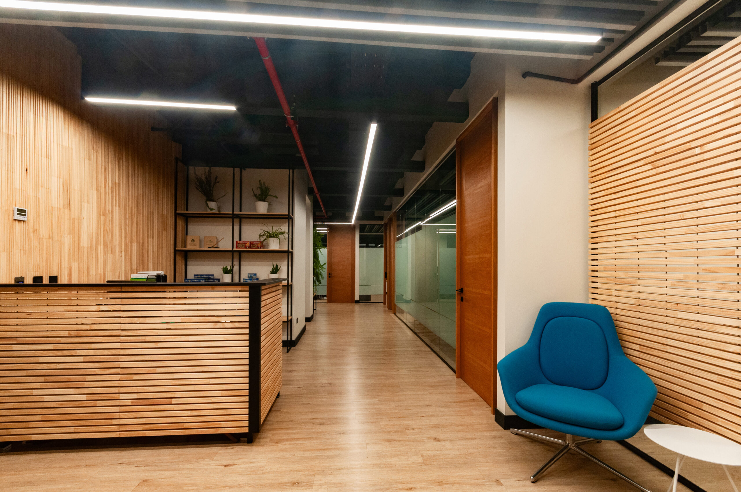 Proyecto para empresa privada que fusiona modernidad y calidez mediante el uso de la madera, incorporando tecnología avanzada para lograr eficiencia y confort.