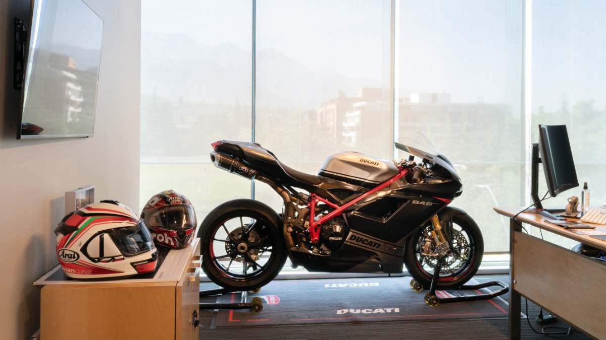 Un espacio innovador para una empresa de inversiones, integrando un diseño moderno y funcional. En su interior, una moto en exhibición que simboliza dinamismo y movilidad. La arquitectura refleja profesionalismo y espíritu emprendedor.